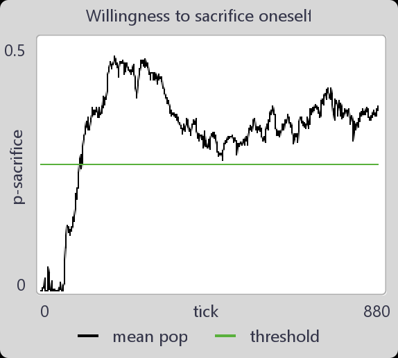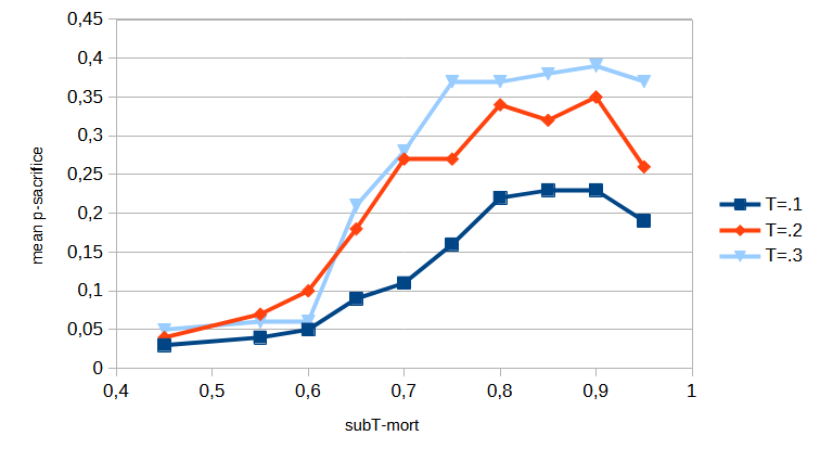 Important for the development of this willingness is that if too few group members sacrifice themselves, the remaining group members have a probability of approximately 0.7 to 0.95 of dying (subT-mort = sub-threshold mortality). If the probability is less than 0.6, the willingness will not develop. If the probability approaches one, the entire population will die out.
