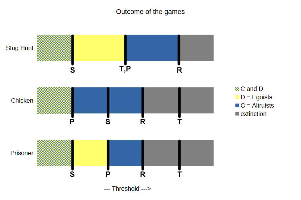 However, our simulation of a group-structured population with a global selection threshold shows that a population of C players develops stably if the selection threshold is greater P (value for D playing against another D) but less or equal R (the value a C player receives when interacting with a D player).